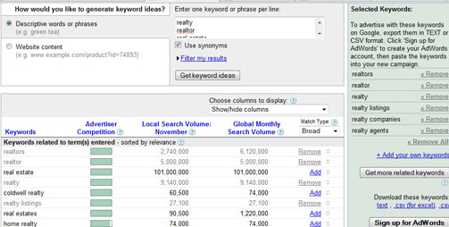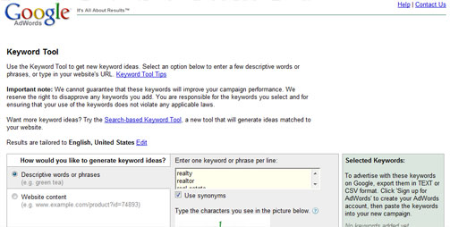 The first step in your keyword research will be to go to Google and find out what phrases are being searched. To do this you will use their keyword tool. This is located HERE. Try searching for broad phrases such as Real Estate, New Home, Realty, etc. Honestly, if you are going to run your campaign locally (and you are in this example) you really can't go too terribly wrong with broad keywords (unless you just get silly with phrases such as 'home').